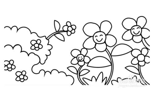 在画纸的右边画出几朵大大的画花朵,在花蕊出画出开心的表情