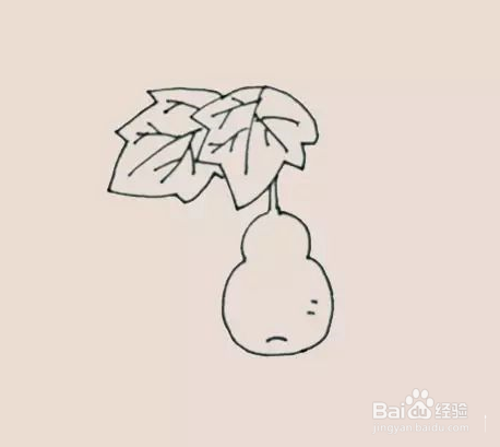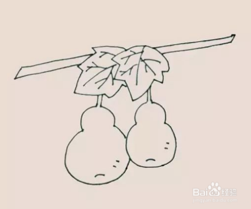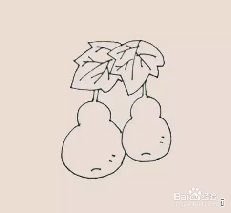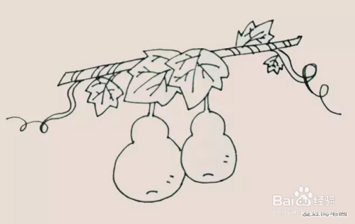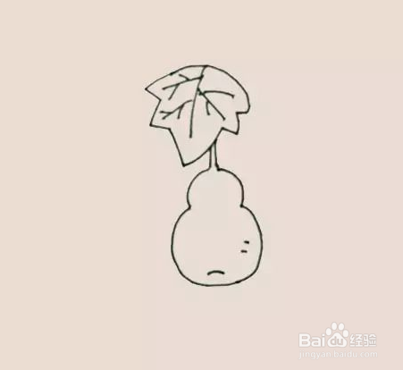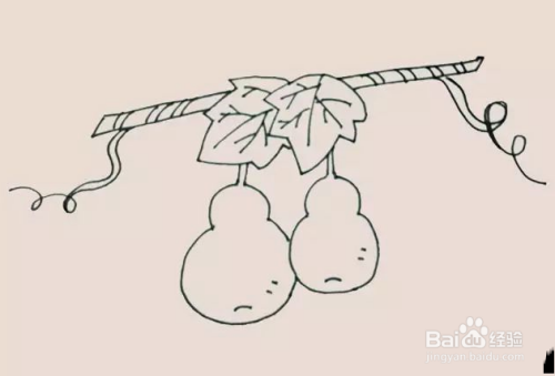 在叶子的下面,画出一个藤,藤下开始画葫芦,左右各是一条小弧线再接一条大弧线。