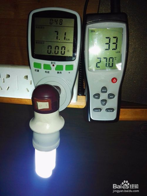 5接下来将测量普通节能灯具的照度与电功率情况: 1 传统U型节能灯 标称: 9W, 实际: 7.1W, 标称与实际功率差距:9-7.1=1.9W, 照度:33Lux, 每瓦照度=33/7.1=4.6Lux/W,