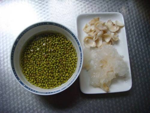 干银耳加水泡发后,去掉根部的黄色部分,洗净杂质,分成小朵。干百合泡发洗净。绿豆也提前泡一夜。
