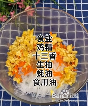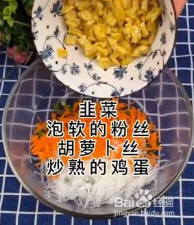 首先准备食材:在碗里加入韭菜、泡软的粉丝、胡萝卜丝和炒熟的鸡蛋