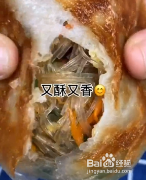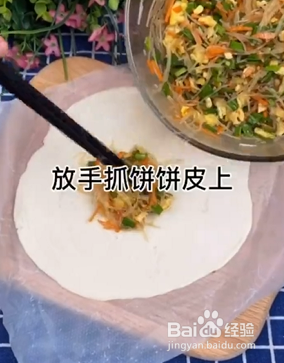 接着将手抓饼放软之后,将馅倒在上面,包起来,压扁一点