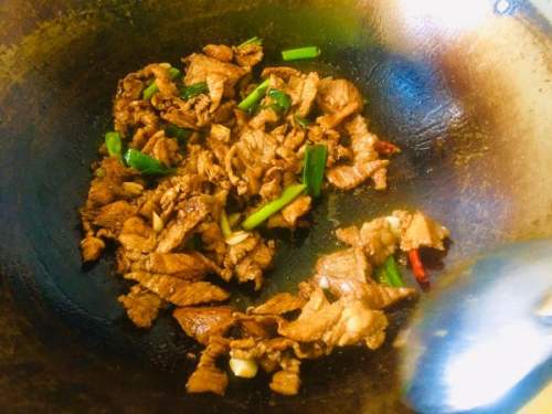3炒锅上火放油烧热,放入肉片煸干水分,放葱花、蒜蓉爆出香味,再放五香粉煸炒,放酱油上色。