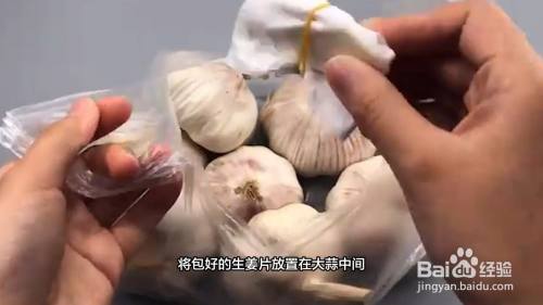 用皮筋固定住,将包好的生姜片放置在大蒜中间,这样你的大蒜就能保存很久了。