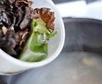 5.这时候可以按下中途加菜功能键,离烹饪时间结束前的十分钟时,会自动排气,气排完时会有提示音。这时候放入泡好洗净的木耳和海带。