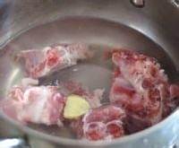 1.排骨冷水下锅,放入两片姜,煮到水开。