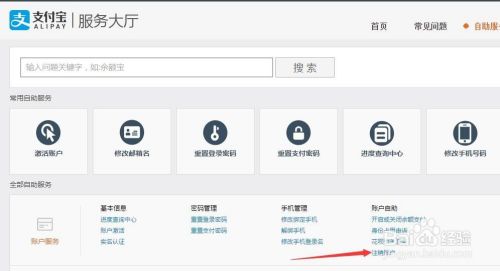进入支付宝服务大厅页面,在“账户服务”选项中,点击“注销账号”