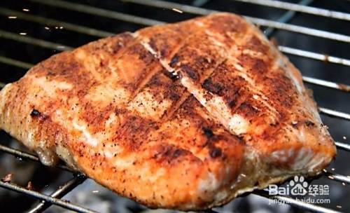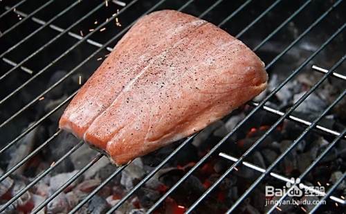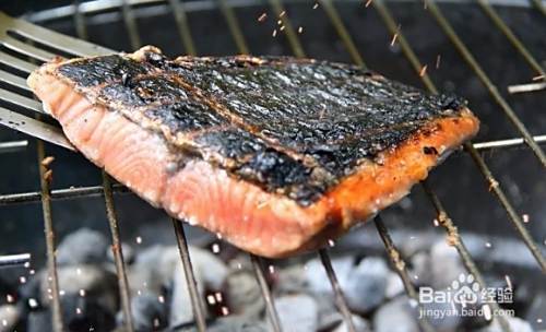 烤焦。将三文鱼放在烤架上最热的部位,使三文鱼身上有烤架的烙印。这个过程每一面只需要一分钟。