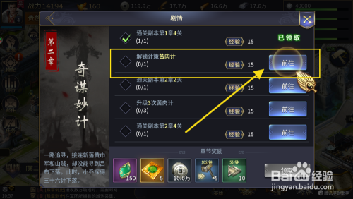 领取第二章解锁计策苦肉计,点击前往按钮。