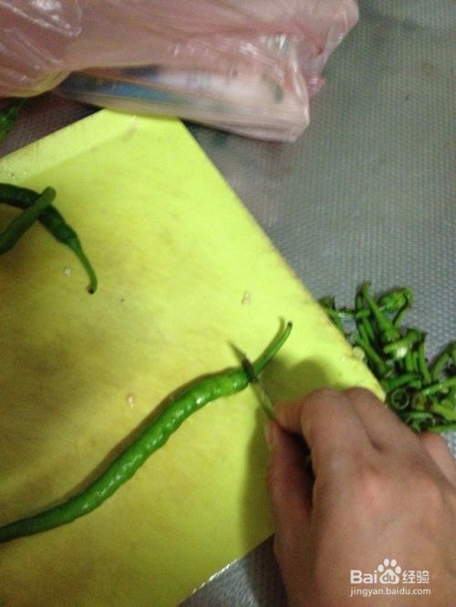 4. 最好处理辣椒时用小刀子,因为并不是所有的辣椒都长的规规矩矩,有弯弯曲曲的辣椒时用小刀子划开口子会更容易些
