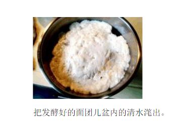 把面盆里注入清水,然后把和好的面团浸泡在清水盆里,进行慢速发酵