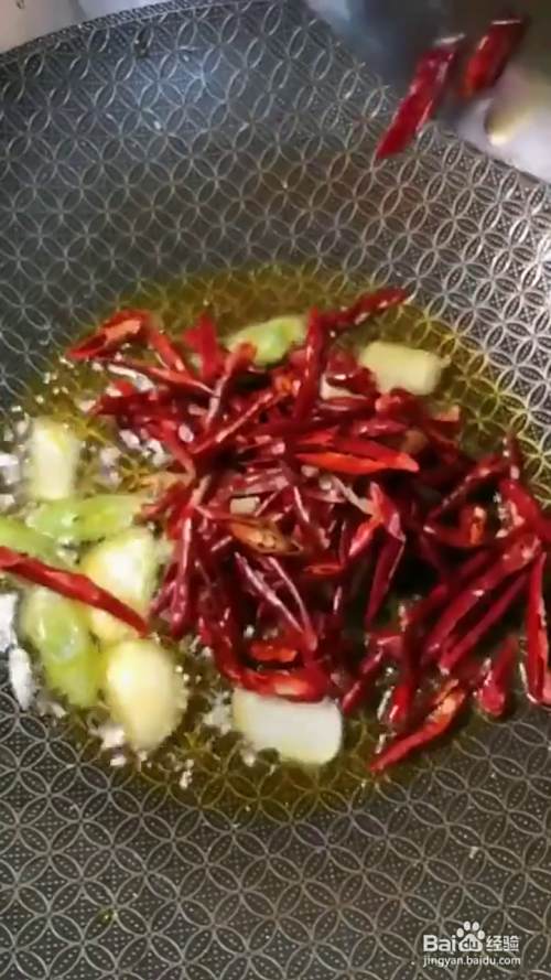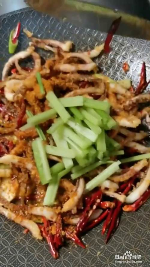 起锅烧油,放入葱姜蒜爆锅,再放入干辣椒炸香,下入鱿鱼加烧烤料和配菜,翻炒出锅即可