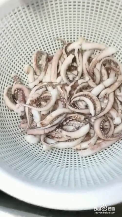 我们准备鱿鱼去牙,处理好后改刀成小块,水开将鱿鱼烫一下,再用清水洗净控干水分