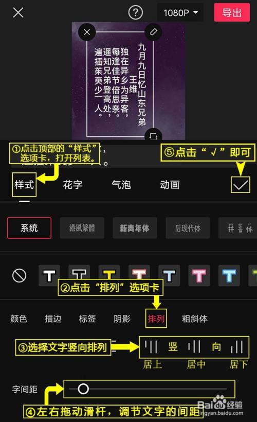 设置竖向排列。点击顶部的“样式”选项卡,打开列表,点击“排列”选项卡,选择文字竖向排列,左右拖动滑杆,调节文字的间距,最后,点击右上角的“√”,大功告成。