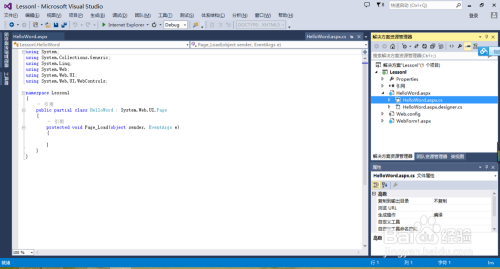 找到Page_Load()方法,该方法在页面加载时被调用。在该方法中编写向页面发送一个“HelloWord!”字符串代码, 如图所示