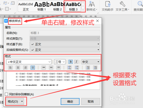 3以“标题3”的设置为例。将鼠标放在“标题3”上,单击右键,选择修改样式。根据要求设置格式。设定好后,点击确定,完成设置。“标题1”“标题2”也如此设置。