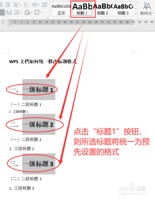 6点击刚设置好的“标题1”按钮,则所选标题统一修改为预先设置的格式。
