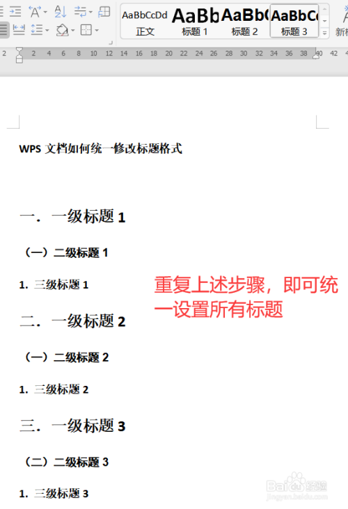 “标题2”、“标题3”重复上述步骤,即可统一设置所有标题。