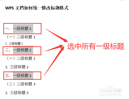 5在“标题1”“标题2”“标题3”格式均设置完成后,进行统一格式修改。首先选中所有一级标题。