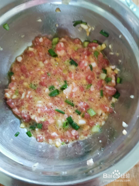 3、加入姜蒜、葱花、盐、生抽、香油搅拌均匀;