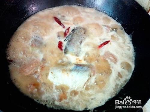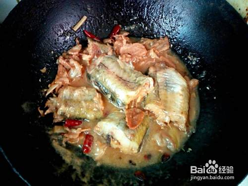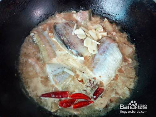 晃动锅避免鱼粘连锅底,煎塌至鱼颜色微黄,把勾兑好的料汁倒入锅中,略烧一分钟。然后放入清水,水和鱼一平即可,再放入花椒,八角,红干椒,大火烧开,撇除汤上面的沫子,转小火慢炖。
