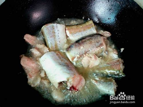 锅内放入油加热,油热后,放入鱼,中火煎塌,把切好的猪肉片放入锅边,一同煎塌。