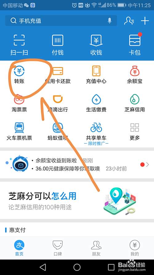 存在余额宝中的资金虽然在取现时不能实时到账,但是如果用于转账时可以实时到账的,我将通过下面的步骤演示如何用余额宝中的余额为他人支付宝转账。