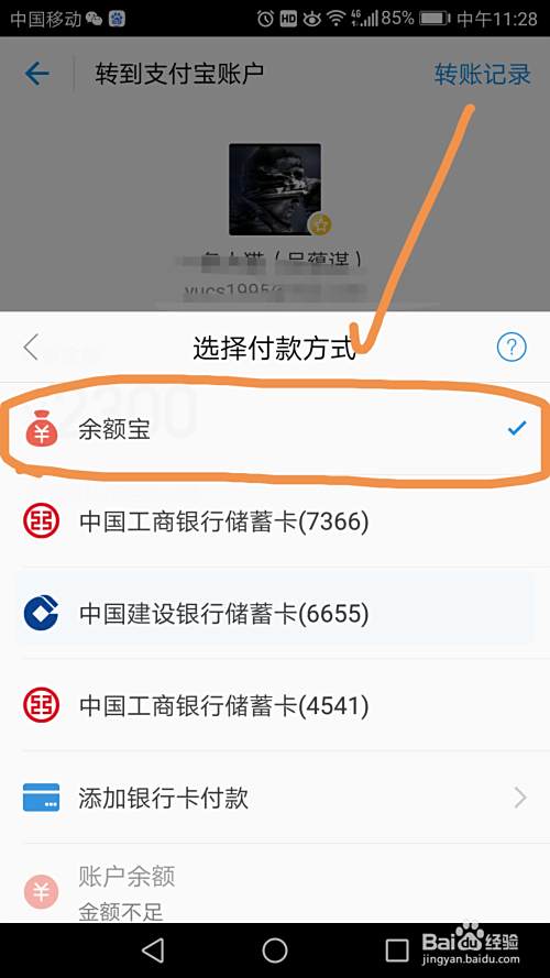 在接下来的界面中点按转账到支付宝账户,如下图中箭头所指。