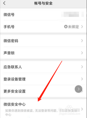 进入微信设置页面,点击帐号与安全,点击微信安全中心。