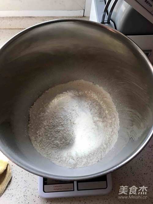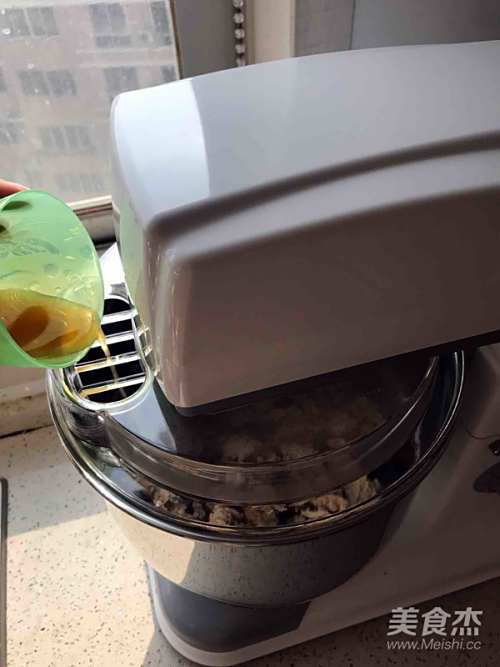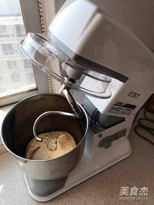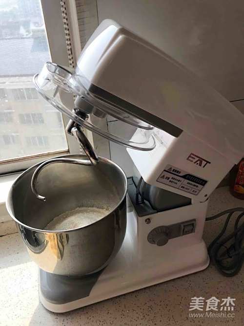 9厨师机装上搅拌钩,先开1档搅拌,防止面粉飞溅,再4档继续搅拌
