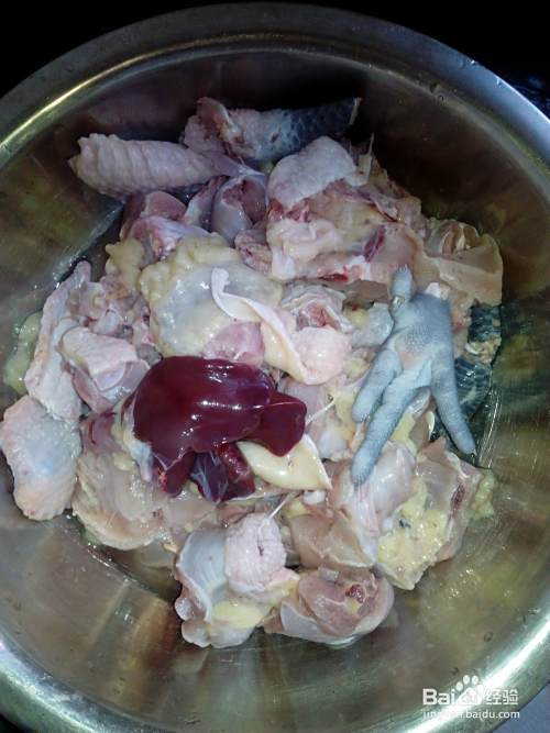 鸡切块,洗净入盘中。一定多洗几遍哦。