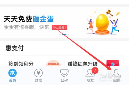 首先我们打开我们的支付宝,进入支付宝的首页,在首页界面点击下方的我的。