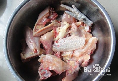 首先要将鸡肉要去皮,再剁成大块.(翅膀的皮太难弄了,我就将就了)