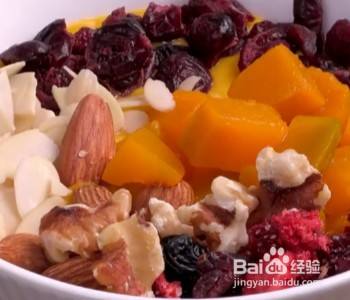 再依次加入熟南瓜块、蔓越莓干、杏仁、巴旦木、混合坚果;