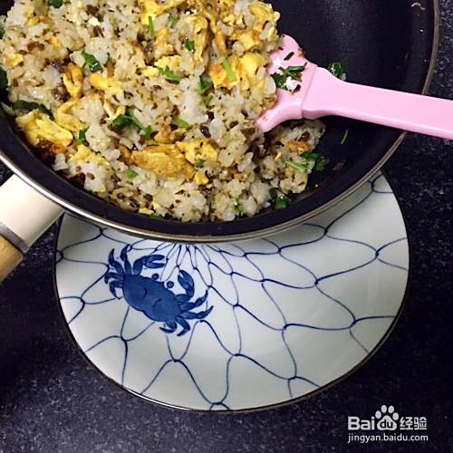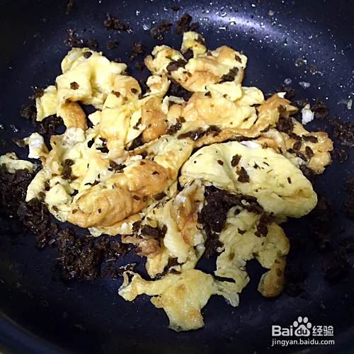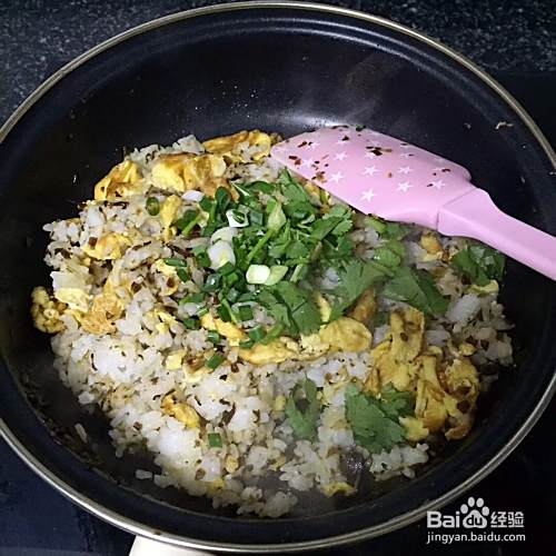 用葱和香菜炒。我没有其他调味品(因为鸡蛋加一点盐芽很好吃)