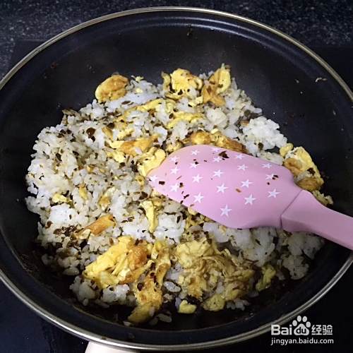 加入米饭和米饭,用锅铲均匀地压,鸡蛋和豆芽一起炒熟
