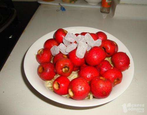 2把山楂,苹果和冰糖混合到大裁脾膨碗里,放进微波炉加热