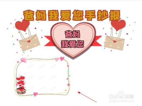 在爸妈我爱您手抄报的中间下方画一个心形边框,在边框里面写上爸妈我爱您