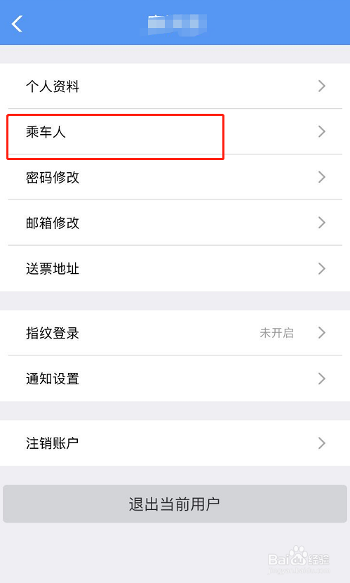 这样就会进入到当前账号的个人信息页面了。在这个页面内点击“乘车人”选项。