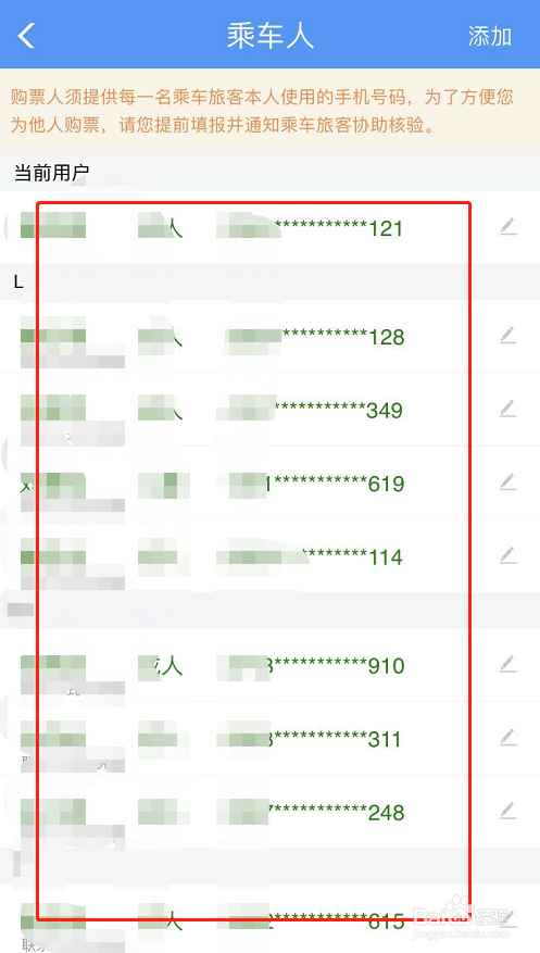 之后就会进入到乘车人页面了,在乘车人页面内显示了当前账号添加的全部的乘车人,以及他们的信息。