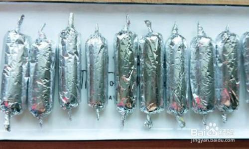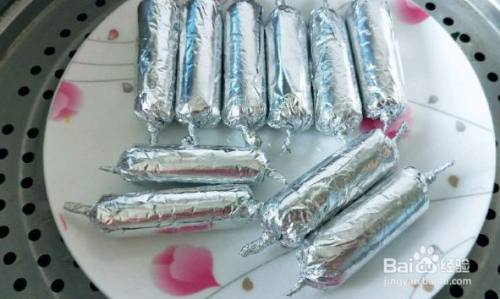 搅拌好的肉泥分成小份裹到锡箔纸里面,然后卷起来两边捏紧。