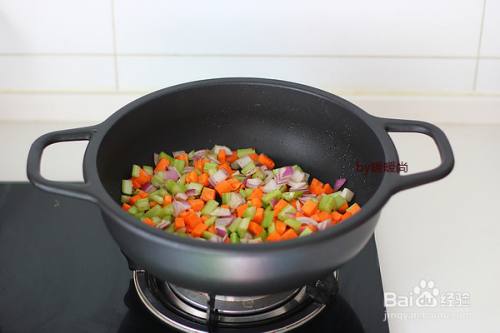 利用煎牛尾的余油将胡萝卜、洋葱和西芹丁炒软,关火。