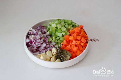 胡萝卜、洋葱、西芹处理干净后切指甲盖大小的丁,大蒜、香叶、干的迷迭香(没买到百里香用了干迷迭香,没有也可不放)备好待用。