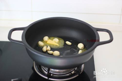 锅子提前预热,放黄油、大蒜炒出香味。