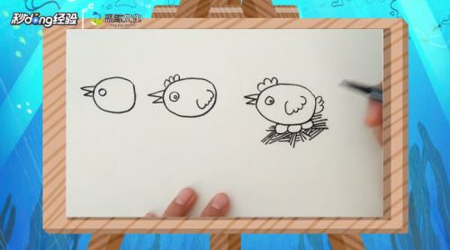 用铅笔画出母鸡的头部、眼睛和嘴巴,并用黑色笔描边。