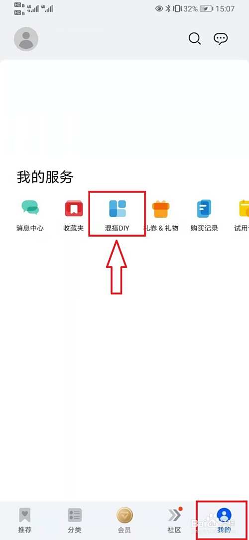 在华为手机的主题应用【我的】页面中,在【我的服务】中打开【混搭DIY】选项,如下图所示。