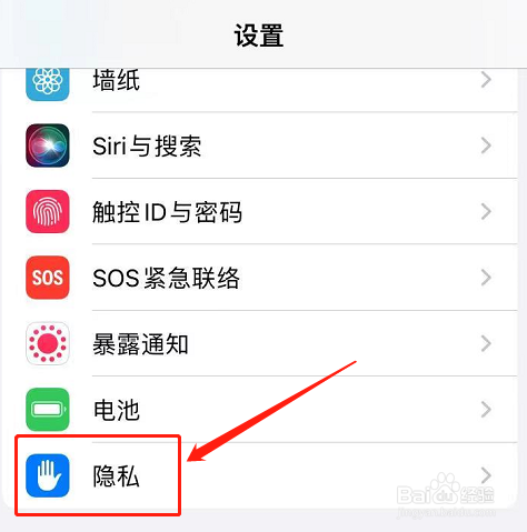 在手机上打开【设置】页面,然后点击【隐私】,如图所示。