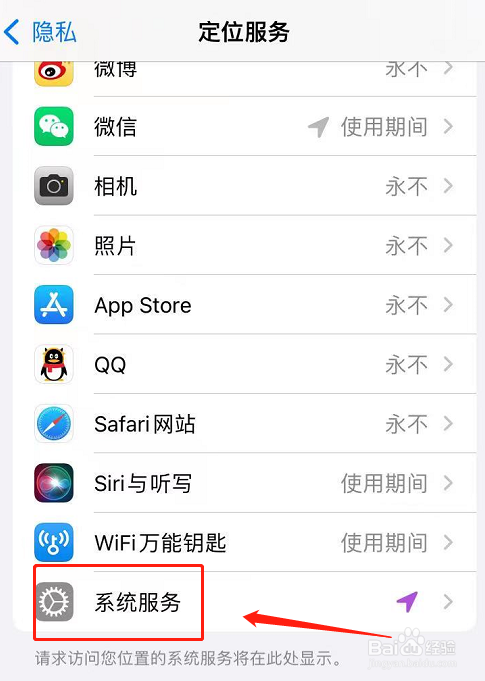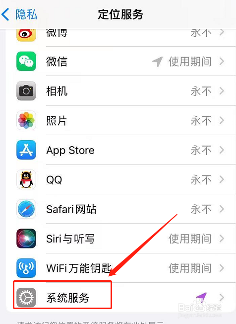 在隐私页面中,点击【定位服务】,往下拉找到【系统服务】,如图所示。