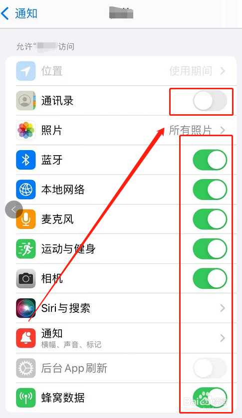 打开一个软件,然后查看它的权限,一般【通讯录】这个按钮可以关闭,然后还有定位,可以设置为【使用期间】使用,如果没必要,可以选择关闭,如图所示。
