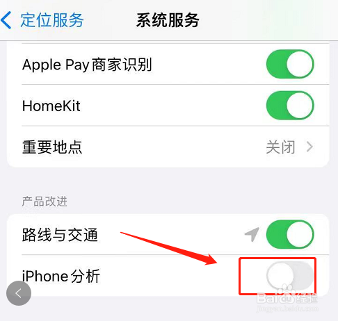 页面往下拉,然后把【iPhone分析】的开关按钮关闭,如图所示。